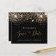 A girly and trendy Save the Date card for a Quinceañera, 15th birthday party. A black background decorated with faux gold glitter. Templates for a date and name and text. Golden colored letters. The text: Save the Date is written with a large trendy hand lettered style script.