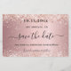 A Save the Date card for a Quinceañera, 15th birthday party. A blush pink metallic looking background decorated with rose gold faux glitter dust. Personalize and add a date and name/age. The text: Save the Date is written with a large trendy hand lettered style script with swashes.