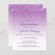 This trendy quinceañera invitation features a sparkly purple faux glitter drip border and ombre background. The word "Quinceañera" and the name of the guest of honor appear in casual purple handwriting script. The same purple glitter drip design appears on the reverse side.