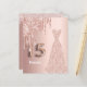 Elegant, classic, glamorous and girly style Quinceañera, 15th birthday invitation. A rose gold dress with faux rose gold glitter drip. Rose gold faux metallic looking background. Personalize and add her name on front. Number 15 is written with a balloon style font.