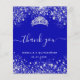 A Quinceañera, 15th birthday thank you card. A royal blue background color. Decorated with faux silver glitter dust. On front large white hand lettered script and the text: Thank You.
