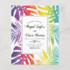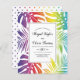 BUDGET Rainbow colors pattern of tropical leaves gay lesbian wedding invitation with QR code on the back to RSVP online. It features a colorful pattern of tropical monstera and palm leaves in rainbow colors and your text in a frame with black border. Your names are in script typography while the back includes the QR code to RSVP online.