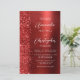 The left-hand edge of this elegant modern wedding invitation features a red faux glitter border. The customizable text combines white handwriting, copperplate and italic fonts on a red faux brushed metal background. The reverse side provides space for wedding details on a red brushed metal background, along with a QR code guests can scan to visit your website and RSVP, which saves the cost of printing and mailing separate RSVP cards.