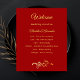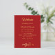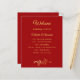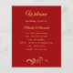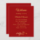 A red colored background decorated with golden florals, swirls. Personalize and add your names and wedding details. Golden colored letters. If you have more text it's possible to reduce the line space, and add text on the back.