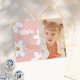Budget birthday party invitations for any age girl! Celebrate their upcoming milestone with this fun, 70's style design featuring a photo of the birthday girl, and her name in big, groovy font typography with her age below in modern handwriting. There are white daisy flowers over a blush-pink background. The party date appears in the middle of one of the daisies. The event details are separated into three sections for clear and simple information. The first shows the time and RSVP contact information; the second is the venue and address; the third is a space for any custom message or extra info. On the right-hand side, there is a photo of your choice! A cute, boho twist on a retro theme. Photo cards are our favorite, as they double up as perfect keepsakes and can be displayed on the fridge, on a board, or in an album! We have chosen a classic hippie orange and pink color scheme. The age can be changed for any age child - whether it is your little one's first trip around the sun, if she is two groovy, young, wild, and three, four ever young, or if five is a vibe! These cards reverse to a pattern of the same big hand-drawn daisies covering a pink background. Bold and cute, modern and retro, hippie and minimalist, all at once! To start customizing this design, click on "Personalize this template" and change the text in the boxes provided. If you would like to make more advanced changes, scroll to "Click to customize further" to access Zazzle's intuitive design tool. The background color, text, fonts and font colors, placement, and positioning are all fully customizable to match your event or suit your needs! A standard invitation version of this design is available in my store. This is a budget-friendly option and we recommend the semi-gloss paper type, not the satin finish! Feel free to message me with any questions or custom order requests - I'll be happy to help!