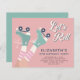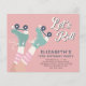 Budget-friendly roller skating birthday party invitation for any age featuring "Let's Roll!" in a white script and a retro-inspired illustration of teal roller skates on a girl wearing pink-striped tube socks. Add her name and birthday year in dark teal blue typography.