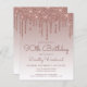 This trendy 90th birthday invitation features a sparkly rose gold faux glitter drip border and ombre background. The words "90th Birthday" and the name of the guest of honor appear in dark rose casual handwriting script, with the rest of the customizable text in sans serif font. The same rose gold glitter drip design appears on the reverse side.