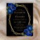 This design features a gold geometric frame decorated with royal blue watercolor floral bouquets and greenery, surrounding gold-colored text on a black background. The back of the card is solid black.