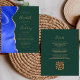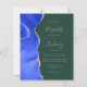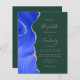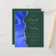 The left-hand edge of this elegant modern wedding invitation features a royal blue watercolor agate border trimmed with faux gold glitter. The customizable text combines gold-colored handwriting, copperplate and italic fonts on an emerald green background. The reverse side provides space for wedding details, along with a QR code guests can scan to visit your website and RSVP, which saves the cost of printing and mailing separate RSVP cards.