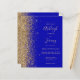 The left-hand edge of this elegant modern wedding invitation features a gold faux glitter border. The customizable text combines gold-colored handwriting, copperplate and italic fonts on a royal blue background. The reverse side features a matching royal blue and gold design.