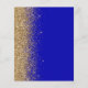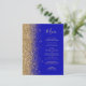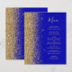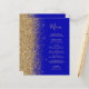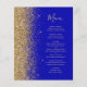 The left-hand edge of this elegant modern wedding menu features a gold faux glitter border. The customizable text combines gold-colored whimsical handwriting script and copperplate fonts on a royal blue background. The reverse side features a matching royal blue and gold glitter design.