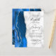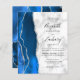 The left-hand edge of this elegant modern wedding invitation features a royal blue watercolor agate border trimmed with faux silver glitter. The customizable text combines black handwriting, copperplate and italic fonts on a gray and white marble background. The reverse side features a matching royal blue and silver agate design.