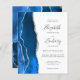 The left-hand edge of this elegant modern wedding invitation features a royal blue watercolor agate border trimmed with faux silver glitter. The customizable text combines handwriting, copperplate and italic fonts in charcoal gray on a white background. The reverse side features a matching royal blue and silver agate design.