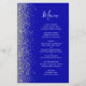 The left-hand edge of this elegant modern wedding menu features a silver faux glitter border. The customizable text combines white handwriting script and copperplate fonts on a royal blue background. The reverse side features a matching royal blue and silver glitter design.