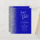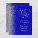 The left-hand edge of this elegant modern wedding save the date card features a silver faux glitter border. The customizable text combines white handwriting, copperplate and italic fonts on a royal blue background. The reverse side features a matching royal blue and silver design.