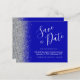 This elegant budget save the date card features a silver faux glitter border. The customizable text combines white handwriting script, copperplate and italic fonts on a royal blue background. The reverse side features a matching royal blue and silver design.