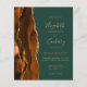 The left-hand edge of this elegant modern wedding invitation features a watercolor agate border in shades of burnt orange and rust, trimmed with faux gold glitter. The customizable text combines gold-colored handwriting, copperplate and italic fonts on a dark green background. The reverse side is solid dark green. NOTE: Envelopes are not automatically included with these budget invitations, so please remember to choose the "white envelopes" option!