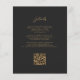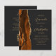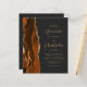 The left-hand edge of this elegant modern wedding invitation features a burnt orange and rust watercolor agate border trimmed with faux gold glitter. The customizable text combines gold-colored script and sans serif fonts on a slate black background. The reverse side provides space for wedding details on a solid slate black background, along with a QR code guests can scan to visit your website and RSVP, which saves the cost of printing and mailing separate RSVP cards.