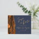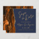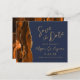 This elegant budget save the date card features a burnt orange and rust watercolor agate border trimmed with faux gold glitter. The customizable text combines gold-colored handwriting script and sans serif fonts on a navy blue background. The reverse side features a matching burnt orange and gold agate design.