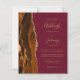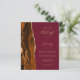 Save the cost of printing and mailing separate RSVP cards with this elegant modern all-in-one budget wedding invitation. The left-hand edge features a burnt orange and rust watercolor agate border trimmed with gold faux glitter. The customizable text combines gold-colored handwriting, copperplate and italic fonts on a burgundy red background. The reverse side provides space for wedding details on a solid burgundy background, along with a QR code guests can scan to visit your website and RSVP.