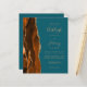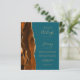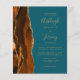 Save the cost of printing and mailing separate RSVP cards with this elegant modern all-in-one budget wedding invitation. The left-hand edge features a burnt orange and rust watercolor agate border trimmed with gold faux glitter. The customizable text combines gold-colored handwriting, copperplate and italic fonts on a teal blue background. The reverse side provides space for wedding details on a solid teal background, along with a QR code guests can scan to visit your website and RSVP.
