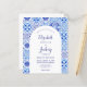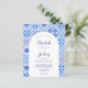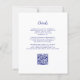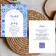 This rustic design features a background pattern of blue and white watercolor Portuguese tiles, or azulejos. Personalize it with the names of the bride and groom in blue calligraphy script and the remaining text in a combination of sans serif, copperplate and italics on a white arch shape. The reverse side provides space for wedding details on a solid white background, along with a QR code guests can scan to visit your website and RSVP, which saves the cost of printing and mailing separate RSVP cards.