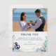 Budget photo wedding thank you card. Rustic beach wedding design combining nautical elements (navy anchor, knot, starfish and bleached wood) with beautiful floral bouquets of blue hydrangea, blush and white anemone flowers, eucalyptus leaves, dahlia, and greenery. Ideal for beach wedding, nautical wedding, destination wedding, summer wedding.