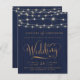 Lovely rustic wood design wedding invitation template. Gold calligraphy on a Navy Blue background with pretty string lights decorating the top of the design. Also includes RSVP details and is easy to customize with your own details.