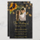 Rustic country wedding ceremony and reception stylish budget affordable all in one invitation template on dark brown barn wood background with arch shape photo and scanning QR code to RSVP online featuring big yellow gold sunflowers bouquets, strings of twinkle lights, and a chic faux gold typography script. +++++++++++ Easy to personalize with your details! ++++++++++++ The invitation is suitable for outdoor garden backyard rustic country weddings.