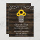 This budget save the date announcement features a mason jar with sunflowers hanging from string lights on a rustic barn wood background.