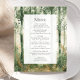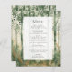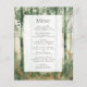 This wedding menu features a rustic watercolor forest landscape background in shades of green and gold. The customizable charcoal gray text appears on a rectangular white screen. The woodland scene is repeated on the back of the card.