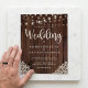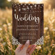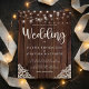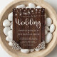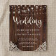Budget Rustic Wood and String Lights Lace Wedding Invitations featuring a rustic wood background with twinkling strings of lights and vintage style lace in the bottom corners. The word wedding is set off in elegant yet rustic typography, making this the perfect design for your boho or country wedding.