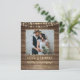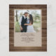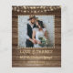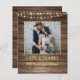 A budget-friendly rustic wedding photo thank you card printed on 4.5x5.6-inch lightweight 110 lb semi-gloss paper instead of cardstock featuring a brown, country weathered wood planks and soft yellow glow string lights along with the title of LOVE & THANKS and your wedding date in a country western hand-printed font and your name in a hand-lettered brush script typography. The back of the card features the same wood plank background and offers a place to type a pre-printed thank-you message (or delete the sample text to leave blank for handwriting personal notes of appreciation. Ideal for conservative budgets and/or hand-delivering to friends and family. ADD ENVELOPES on the ordering page if desired. ASSISTANCE: For help with design modification or personalization, transferring the design to another card style or other product or if you would like coordinating items, contact the designer BEFORE ORDERING via the Zazzle Chat MESSAGE tab below or email makeitaboutyoustore@gmail.com.