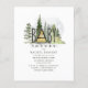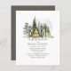 Illustration of rustic a frame house surrounded by trees. Opposite side is wood inspired design.