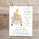 Cute budget-friendly couple's baby boy shower invitation featuring an illustration of baby zoo animals (lion, elephant, zebra, monkey and giraffe) piled into a safari vehicle and "It's About to Get Wild" in fun typography, and "Baby Shower" and the mother and father's names in coordinating army green script. You can easily personalize the shower details, change the "It’s a Boy!" text on the vehicle, and add the shower date on the license plate, or leave blank.