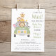 Cute budget-friendly baby boy shower invitation featuring an illustration of baby zoo animals (lion, elephant, zebra, monkey and giraffe) piled into a safari vehicle and "It's About to Get Wild" in fun typography, and "Baby Shower" and the mother's name in coordinating army green script. You can easily personalize the shower details, change the "It’s a Boy!" text on the vehicle, and add the shower date on the license plate, or leave blank. This budget semi-gloss paper is similar in weight to photo paper. A traditional thick card stock version is also available (message us for the link).