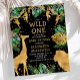 This "wild one" jungle safari themed baby shower invitation features gold faux foil animals (giraffe, lion and monkeys), gold and green jungle foliage, and a sprinkling of gold confetti on a black background. Add the name of the mom-to-be and shower details in white and gold text. A coordinating jungle foliage pattern in green and gold on a black background decorates the back of the card.