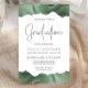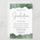 This trendy graduation party invitation features a top and bottom border of watercolor agate geode in shades of sage green with faux silver glitter highlights. The word "Graduation" appears in faux silver glitter in decorative modern handwriting font. Customize the invitation with the name of the graduate in sage green text and the party details in charcoal gray on a white background. A matching sage green and silver agate image appears on the reverse side.