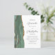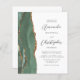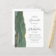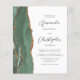 The left-hand edge of this elegant modern wedding invitation features a sage green watercolor agate border trimmed with faux gold glitter. The customizable text combines charcoal gray script and sans serif fonts on a white background. The reverse side provides space for wedding details on a solid white background, along with a QR code guests can scan to visit your website and RSVP, which saves the cost of printing and mailing separate RSVP cards.