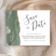 This elegant budget save the date card features a sage green watercolor agate border trimmed with faux gold glitter. The customizable text combines charcoal gray handwriting script, copperplate and italic fonts on a white background. The reverse side features a matching sage green and gold agate design.
