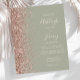 The left-hand edge of this elegant modern wedding invitation features a rose gold faux glitter border. The customizable text combines ivory handwriting, copperplate and italic fonts on a sage green background. The reverse side features a matching sage green and rose gold design.