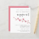 Sakura Cherry Blossom Engagement Invitation. A budget price SMALLER 4.5” x 5.6” alternative. Available in a SEMI-GLOSS 110 lb CARD STOCK which is the default option (thicker for invitations), OR a SATIN FINISH 80 lb THINNER PAPER STOCK (ideal for enclosures). Envelopes are an optional extra and are slightly larger than the card size. Modern minimalist style with a single branch of Sakura florals across the page from the left hand side. Engagement is set in an informal handwriting style and is placed above the leaves along with your names, with the other details beneath. Easily personalise the details to your own. A coordinating Dusty pink background is on the reverse. You can change text and background colors to any of your choice to match your wedding color theme.