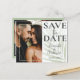 Elegant save the date announcement is prefect to get your wedding plans in motion. It features a photo template and large 'save the date' typography with the addition of a large tropical leaf, all on a white background. Customize with your own detials.