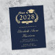 Modern budget-friendly dark navy blue college graduation announcement featuring "Class of" in a gold illustration of a laurel wreath incorporating a grad cap topper and diploma and the graduate's name in an elegant light gold script. Add their school, major, honors or future plans.