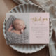 This modern photo thank you note features gold script thank you, personal message and a vertical photo on the front. The back includes a second baby photo that is a full bleed horizontal photo.