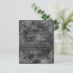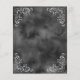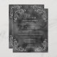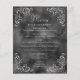 This elegant vintage-inspired wedding menu features the text in pale silver gray script and serif fonts, framed by a vintage silver foliage motif in four corners on a black watercolor background. The frame and watercolor background are repeated on the reverse.