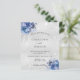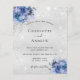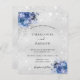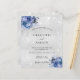 Faux silver metallic looking background decorated with blue florals and faux glitter dust. Personalize and add your names and wedding details. Black colored letters.