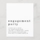 A value for money BUDGET alternative on a smaller size 4.5 x 5.6” semi-gloss 110lbs weight, which is of similar thickness to a postcard (however is not suitable to use as a postcard.). PLEASE NOTE there is ONE invite per sheet. Budget Simple Black White Engagement Party Invite. The header is large in stylish lowercase with the details beneath. Lots of white space at the top for a contemporary feel! Easily personalise the text to your own details.