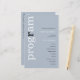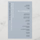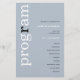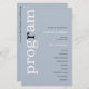 Simple Dusty Blue Text Wedding Program. A budget price size 5.5” x 8.5”, on an elegant 110 lb LINEN stock – for a luxury feel at great value, this is perfect for menus, as well as invitations and programs etc. This budget size alternative is also available in other paper choices. The SEMI-GLOSS 110 lb card stock is about the same thickness as a postcard, so also works well for invitations. The FELT 100 lbs paper is buff colored, NOT white, so adds a rustic touch. The MATTE 80lbs paper stock is bright white, for crisp printing, great for your menus and programs, whilst the SATIN 80lbs paper is thin and light A modern typographical design with Program in large typography in white with the ”r” in black, rotated and to the left hand side on a background of pale dusty blue.