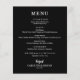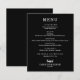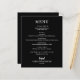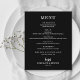A dinner menu card on black features your menu in chic white lettering. Perfect for a modern wedding reception, wedding rehearsal dinner, anniversary party or any special event with a sit down dinner. Choose ANY COLOR BACKGROUND, any COLOR TEXT, any FONT! Easily personalize with your dinner menu and details.